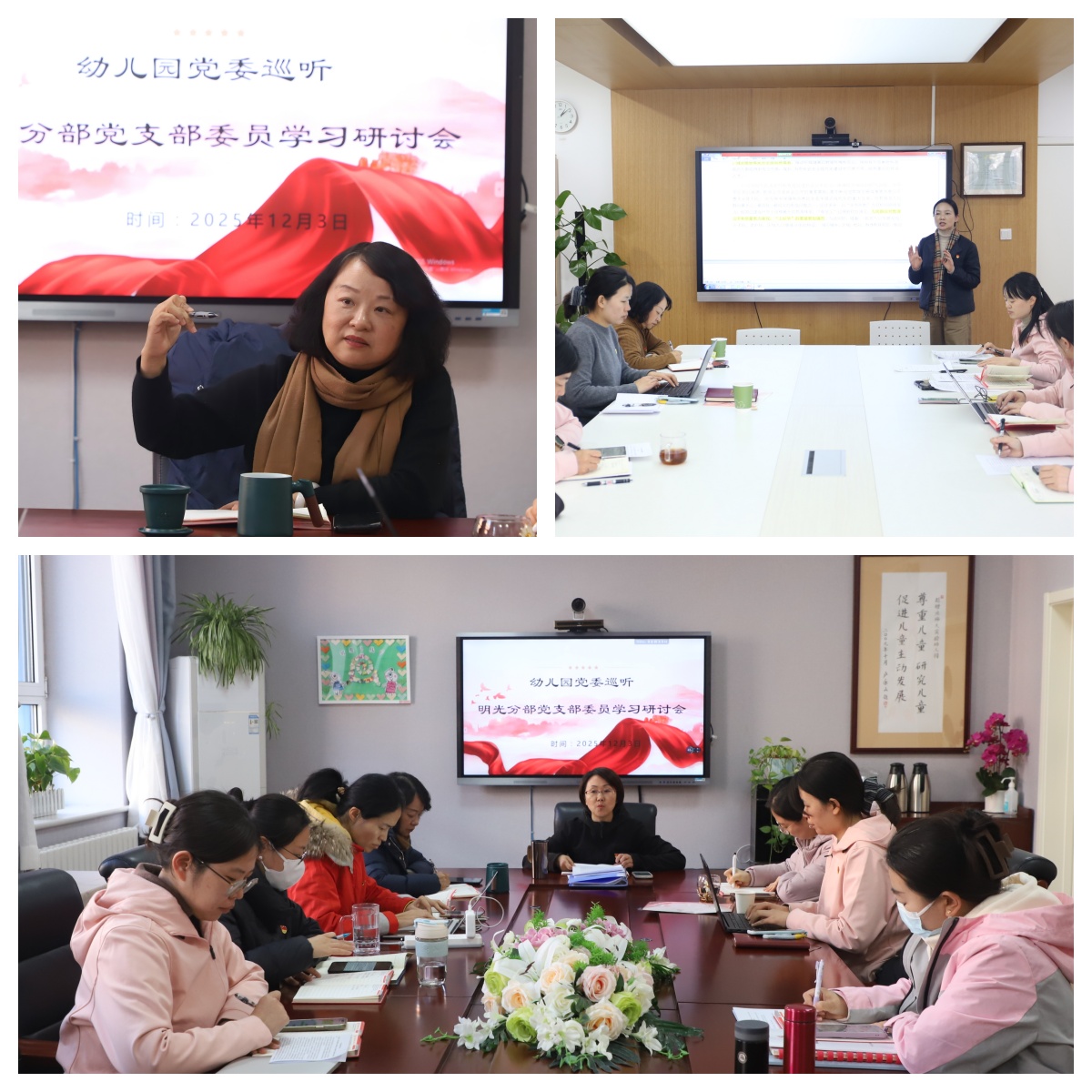 在为期近两周的支部支委会巡听中,杜军书记听取了各支部关于学习宣传贯彻党的二十届四中全会精神、落实“立德树人”根本任务、推进党建与业务深度融合等方面的汇报与研讨。各支部结合自身实际,展现了多样化的学习与实践路径。杜军书记强调,各支部要进一步提高政治站位,深刻领会党的二十届四中全会对教育工作的新部署新要求。她指出,支部委员要明确自身角色定位,既要当好理论学习的“领头雁”,也要成为业务工作的“排头兵”,切实将党的政治优势、组织优势转化为推动园所发展的强大动力。