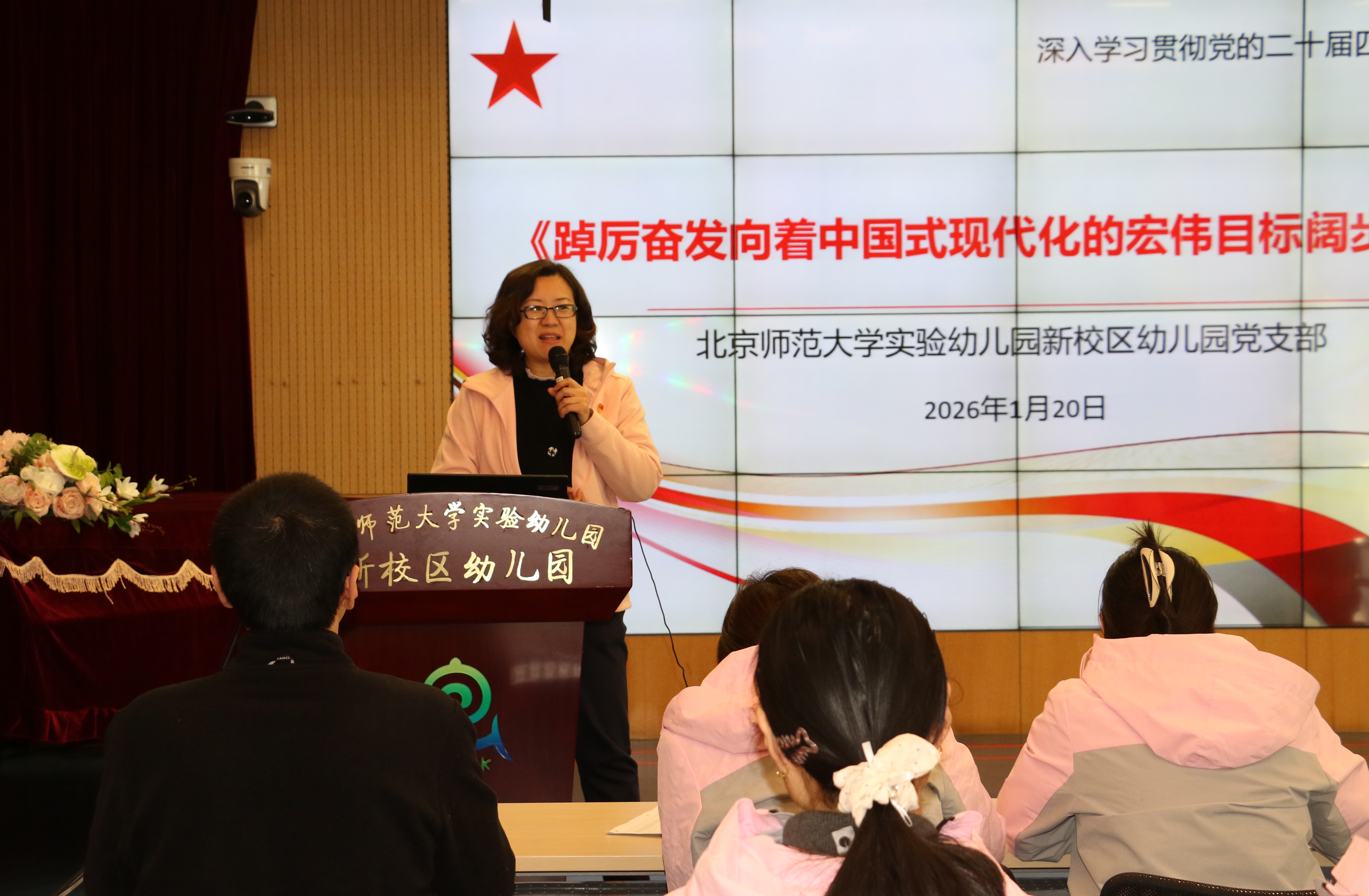 为深入学习贯彻党的二十届四中全会精神,落实立德树人根本任务,2026年1月20日,北师大实验幼儿园新校区幼儿园党支部特邀中国传媒大学马克思主义学院中国近现代史纲要教研室主任张凯副教授为全体党员、积极分子作“踔厉奋发向着中国式现代化的宏伟目标阔步前进”专题宣讲。本次活动共计29人聆听。