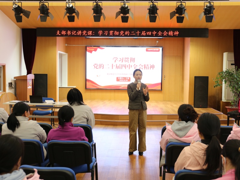 2025年12月10日,北京师范大学实验幼儿园望京分园党支部书记、执行园长丁乐以“学习贯彻党的二十届四中全会精神”为题,为全体教职工讲授专题党课,深入解读全会精神内核,明晰学前教育发展方向,推动理论学习与保教实践深度融合。