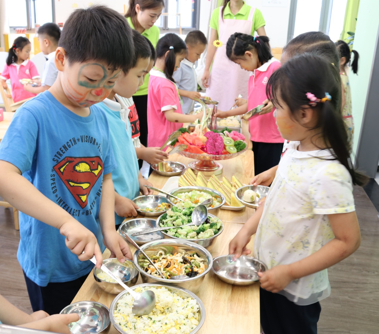 游艺结束后,厨房老师们为孩子们准备了丰盛的自助餐,小朋友情不自禁地说:“自助餐太好吃了!我想再添一些。”看,小馋猫们开吃啦!