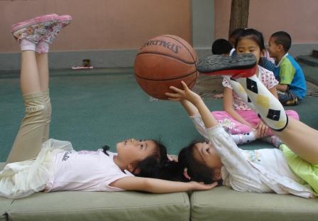 我们有好多的球,有皮球,还有老师用纸做的球。在老师的帮助下,我们不光学会了拍球,还会用各种方法运球、投球,看我们玩的多开心!