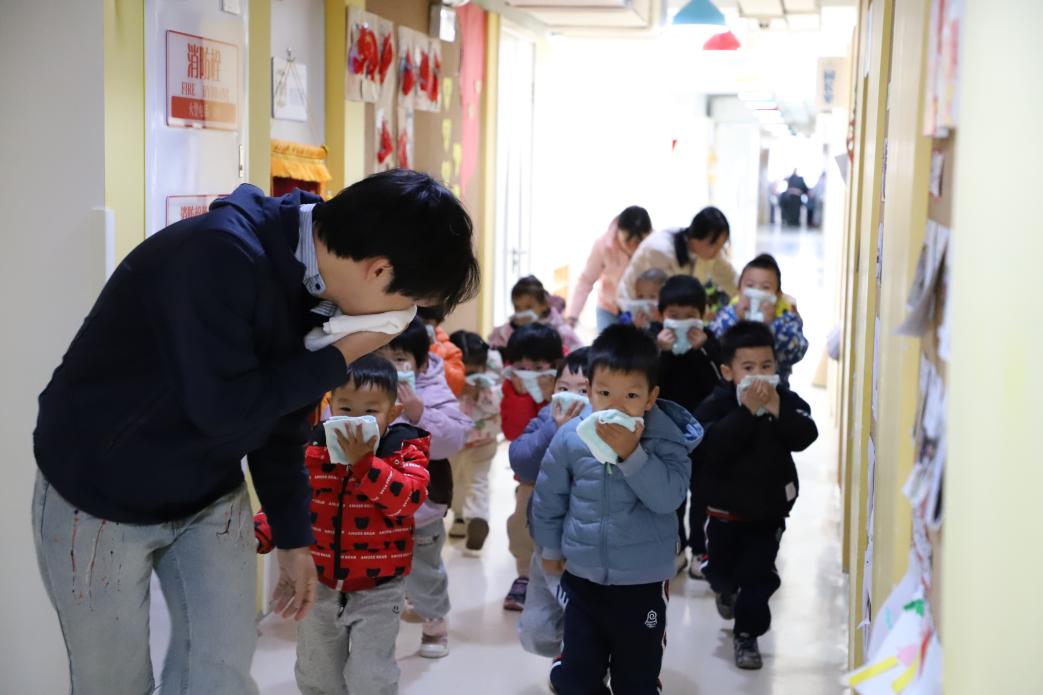 演习开始前,各班教师带领小朋友提前巩固了火灾危害、湿毛巾捂鼻、弯腰撤离等核心逃生知识。随着消防警报声响起,各班教师迅速引导幼儿取湿毛巾捂住口鼻,保持弯腰低姿,沿着预设安全通道快速有序向操场集合。过程中,教师们全程守护,不断提醒“不推挤、慢慢走”,确保每一名幼儿安全,从警报响起至全员到达安全区域,全体师生在3分钟内完成了撤离。