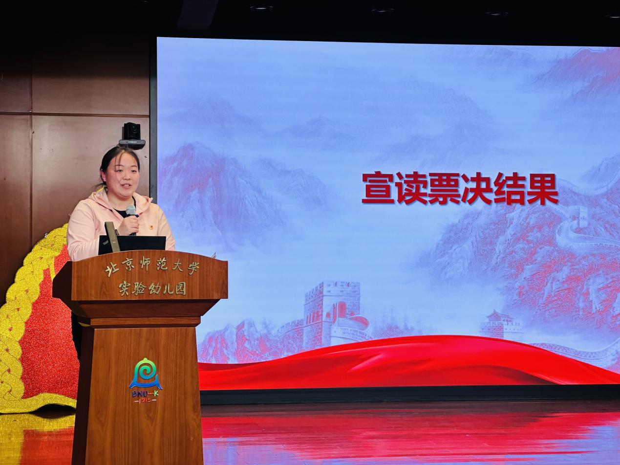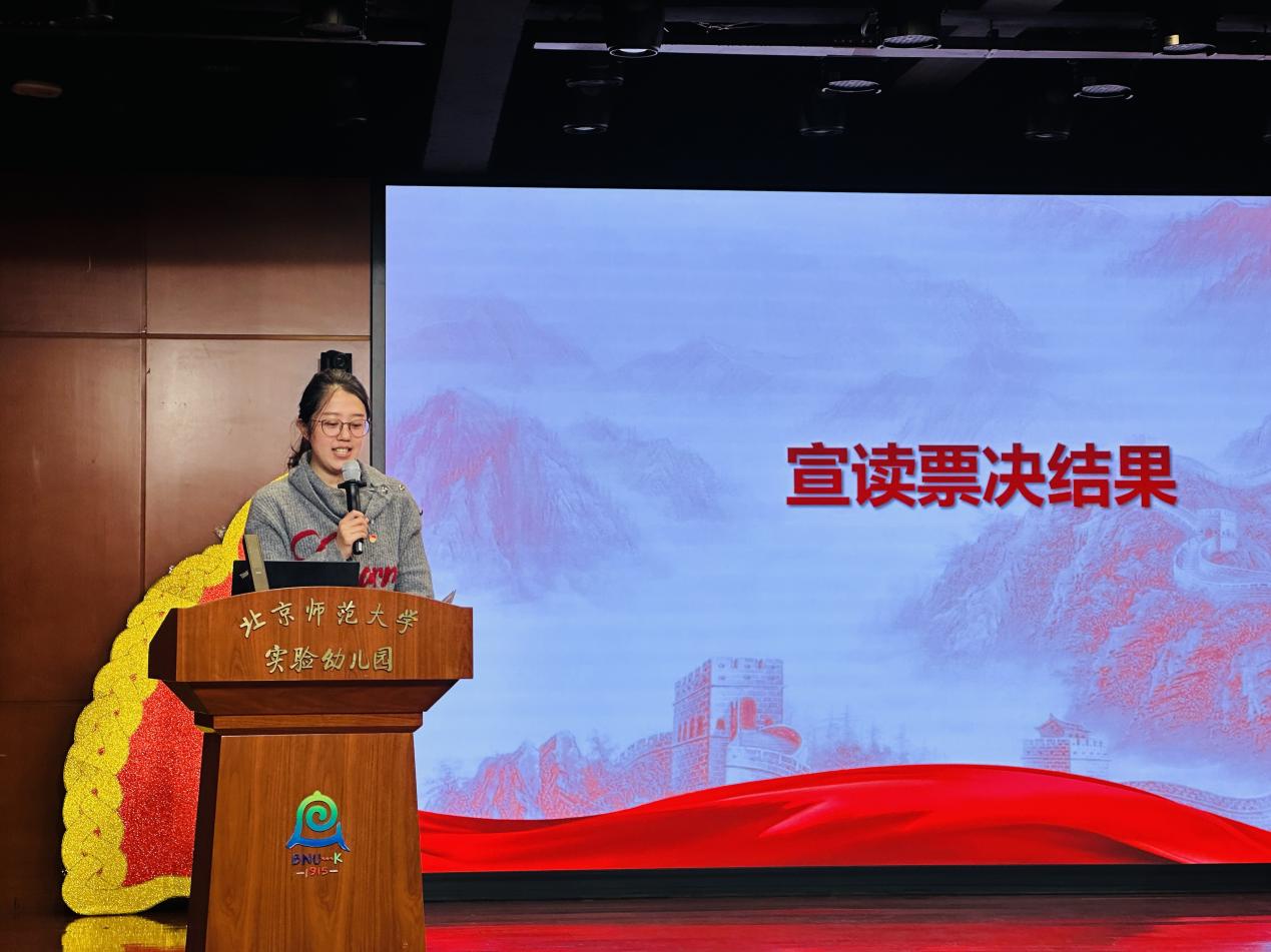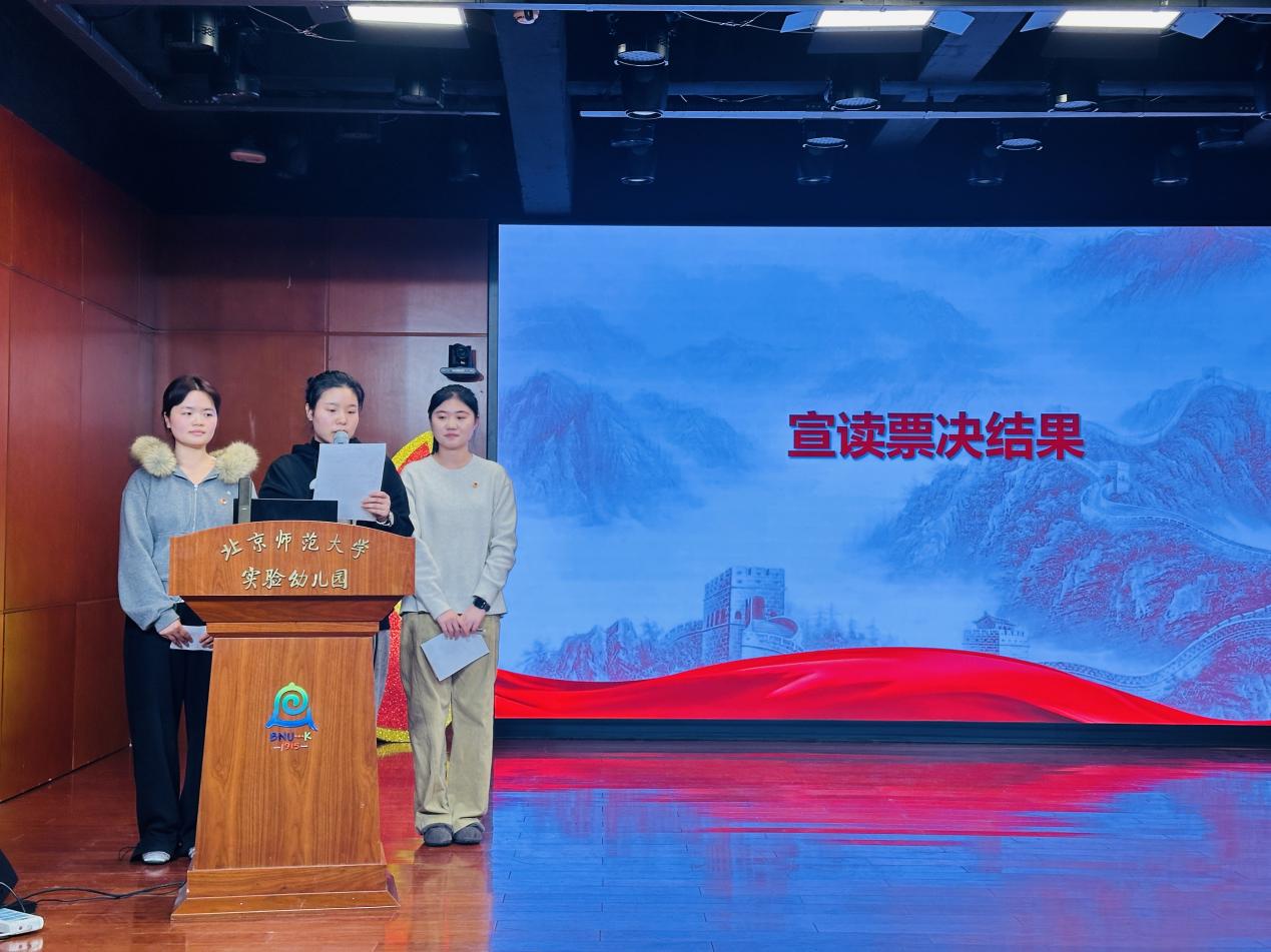 大会严格遵照选举工作流程推进,首先经团员举手表决,一致通过《北师大实验幼儿园团支部委员选举办法(草案)》,现场确定霍立鑫为监票人、马思佳与迟雪巍为计票人。本次选举采用差额选举方式,差额比例不低于20%;经团支部推荐、党支部审核及团员意见征求,最终确定李佳霖、彭之炜、韩丹为正式候选人(按姓氏笔画排序),差额数符合规定比例要求。大会以无记名投票方式进行选举,投票、计票环节规范有序。经统计,韩丹、彭之炜、李佳霖三名候选人得票均超过团员半数,成功当选新一届团支部委员。新当选委员现场作表态发言,表达了立足岗位服务青年、助力幼儿园发展的坚定决心。