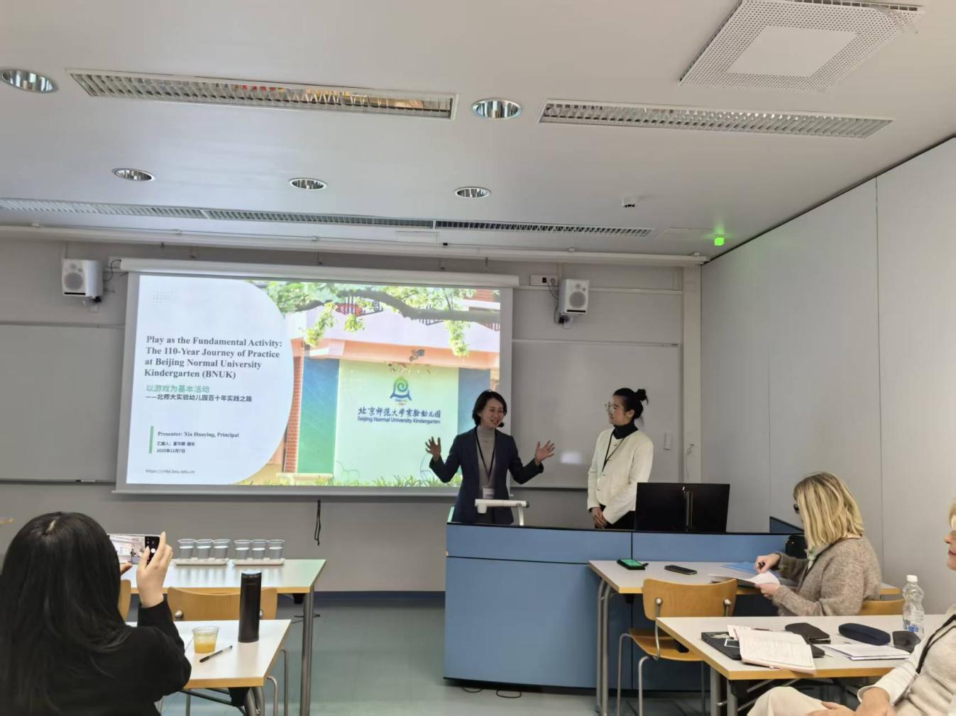 在11月7日上午举行的“中国与芬兰早期儿童教育及教师教育趋势与展望”主题论坛上,夏华颖园长以《以游戏为基本活动——北师大实验幼儿园百十年发展之路》为题作报告。她以我园建园110周年的发展历程为主线,系统介绍了我园在游戏活动方面的探索实践,将我们在儿童教育领域的认识与实践成果推向国际舞台,发出“中国声音”。
