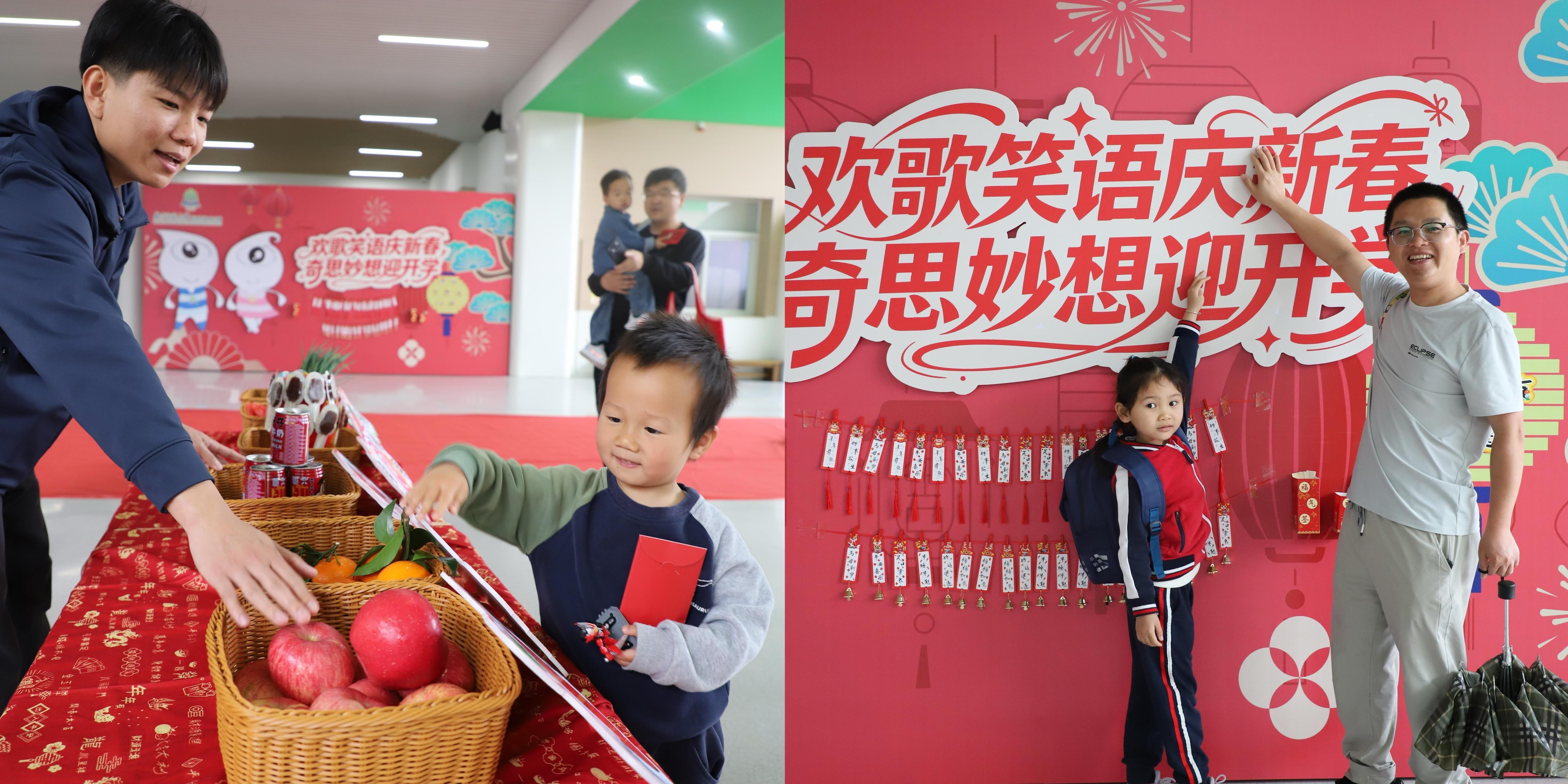 现场开学仪式童趣十足,孩子们跨越祝福栏、摸福果、抽福气签、在新年背景墙合影留念。
